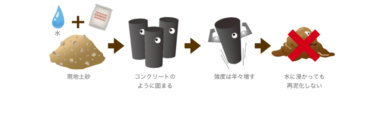 一般の地盤改良で採用されているソイルセメントとは異なり、土砂の特性に合わせてセメント種類を選別し、水和反応が活性化する適切なセメント量、含水比領域を特定します。