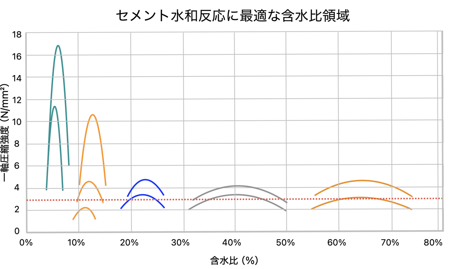 土の種類によってセメント水和反応に最適な含水比は異なります。