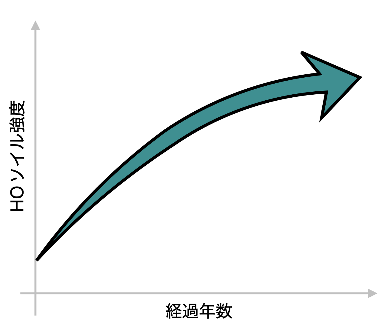 骨材とは異なる土をセメント水和反応で土粒子レベルで改質・固化することで強度を発現します。このため、HOソイルの強度は十数年を超えても増加しており、長期的な耐久性は向上するものと考えられます。