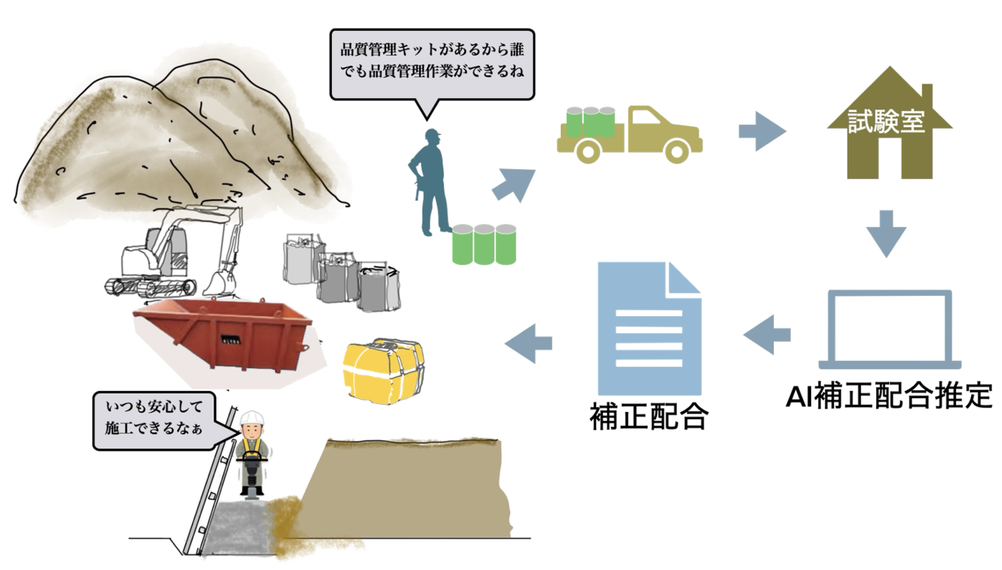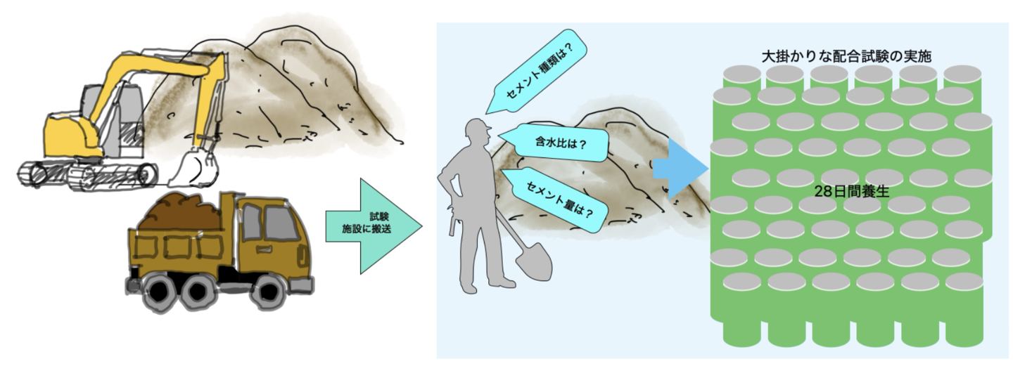 AIによる配合により現地で供試体を作製し、7日強度を測定します。その結果をもとに、試験時の土砂と異なった場合や、品質が確保できない場合は、補正配合を行います。