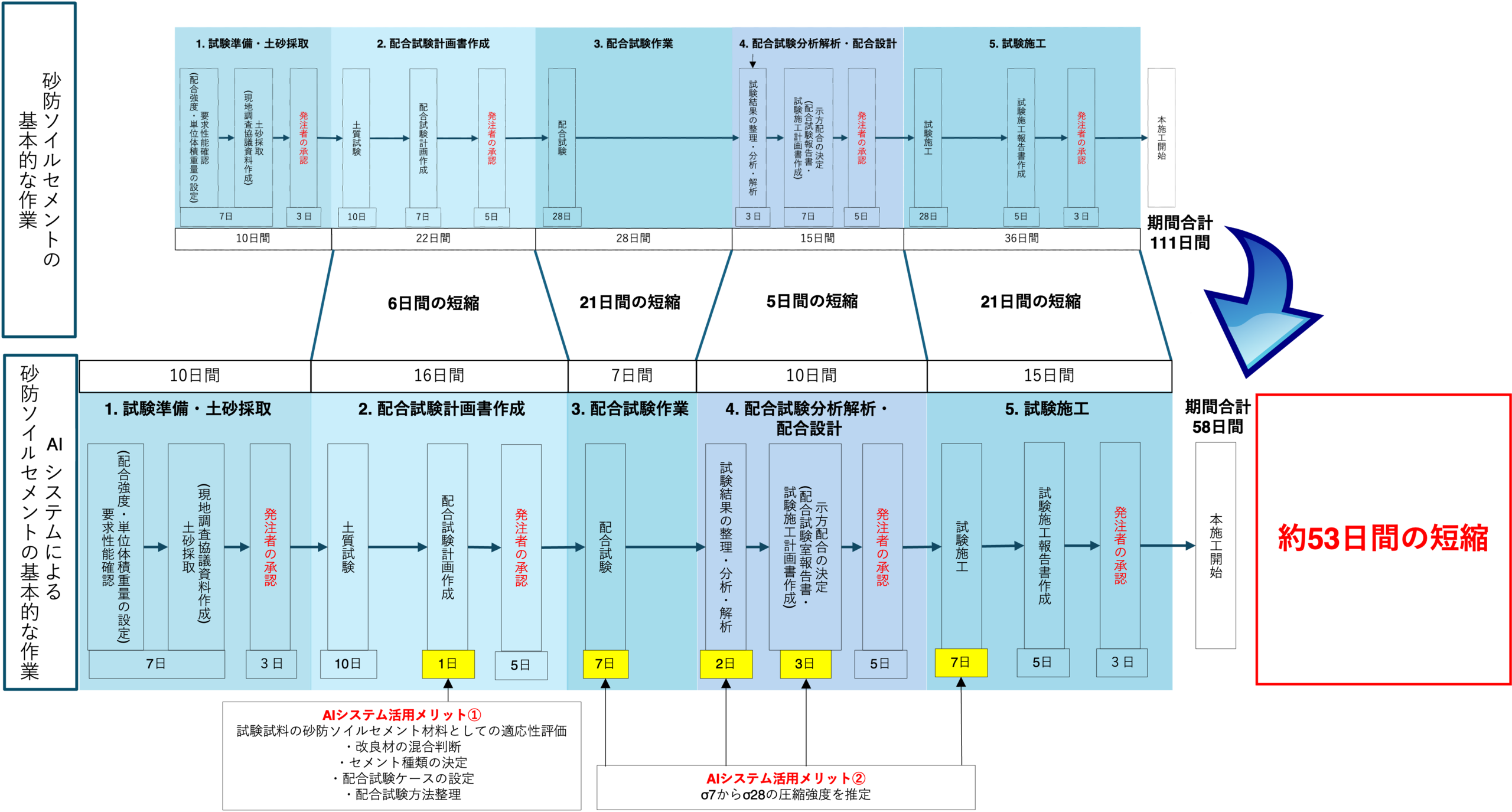 従来通り土質試験を実施し、その結果をAIシステムに入力すると、AIが適応性を評価します。クラッシャーラン等の改良材の混合判断、セメント種類の決定、配合試験ケースの設定、試験含水比の決定は、当社がこれまで蓄積してきた配合試験データに基づきAIが行うため、最適な配合設計の検討に必要とされていた経験と技術による属人的作業(従来約7日間要していた期間)を、1日に短縮することが可能となります。