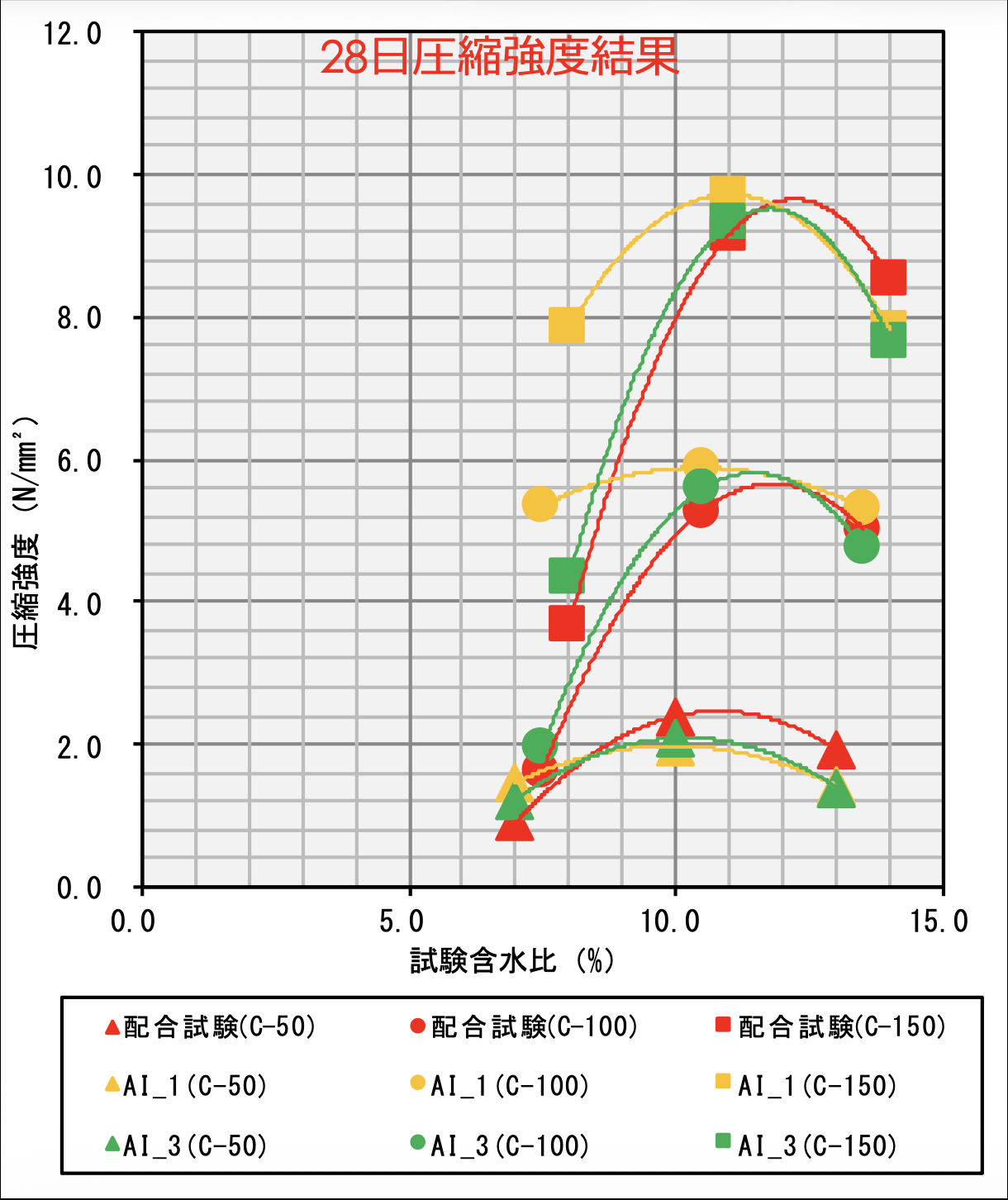 下図に、単位セメント量50、100、150kg/m3時の含水比と材齢28日の圧縮強度の関係をグラフに示しました。赤が従来の配合試験結果、黄色が1データ を基に、緑色が3データを基に AIで推測した結果です。